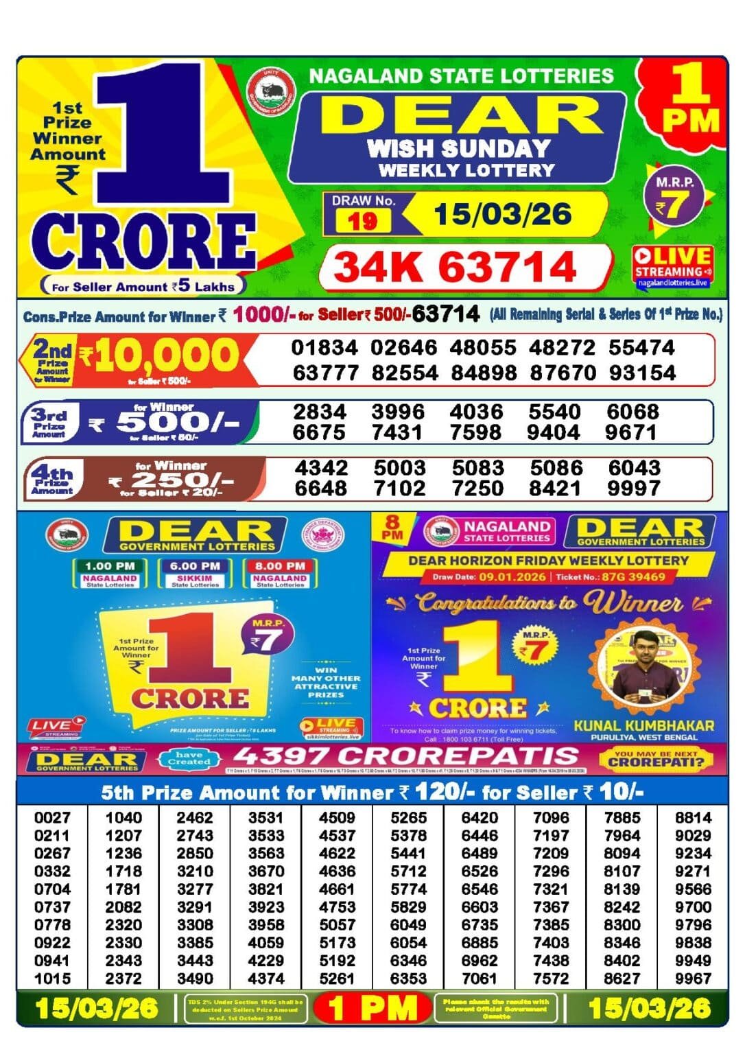 Nagaland State Dear Lottery Sambad Department আজকের 15 Tarikh Lottery Sambad 1 PM Result এর ফলাফল ঘোষণা করেছে, আজকের 15 Tarikh Lottery Sambad 1 PM Result এর প্রথম পুরস্কার টির টিকিট নাম্বার হল- 97A 58783, দ্বিতীয় পুরস্কার এর টিকিট নাম্বার হল- 12224 20152 27747 57373 58329 75946 88591 91375 96010 98669, এবং তৃতীয় পুরস্কার এর টিকিট নাম্বার হল- 0758 2581 3647 4058 6629 7473 7592 8039 9101 9153, এবং চতুর্থ পুরস্কার এর টিকিট নাম্বার হল- 0766 2491 5676 5923 6733 7448 7562 7839 8131 8888, এবং অন্যান্য পুরস্কারের তালিকা নিচে দেওয়া হল।