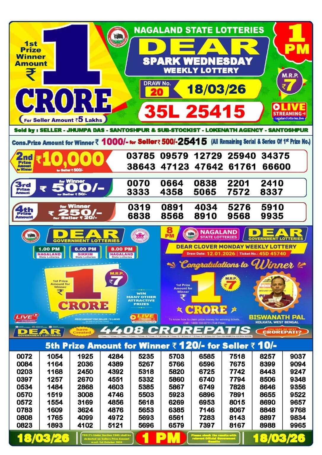 Nagaland State Dear Lottery Sambad Department আজকের 18 Tarikh Lottery Sambad 1 PM Result এর ফলাফল ঘোষণা করেছে, আজকের 18 Tarikh Lottery Sambad 1 PM Result এর প্রথম পুরস্কার টির টিকিট নাম্বার হল- 78L 14535, দ্বিতীয় পুরস্কার এর টিকিট নাম্বার হল- 01702 05238 08412 16353 20415 29398 42223 52221 67740 69252, এবং তৃতীয় পুরস্কার এর টিকিট নাম্বার হল- 0192 0301 0417 0980 1112 1286 1943 3592 8315 8373, এবং চতুর্থ পুরস্কার এর টিকিট নাম্বার হল- 1222 1382 4112 5163 5655 7026 7099 8988 9548 9904, এবং অন্যান্য পুরস্কারের তালিকা নিচে দেওয়া হল।
