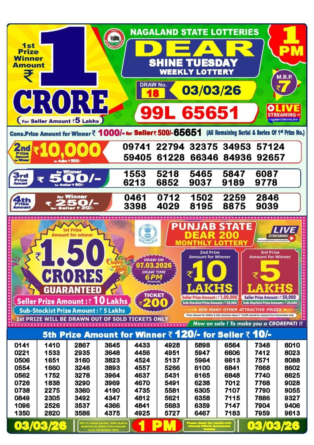 3 Tarikh Lottery Sambad 1 PM 6 PM 8 PM Result 03-03-2026