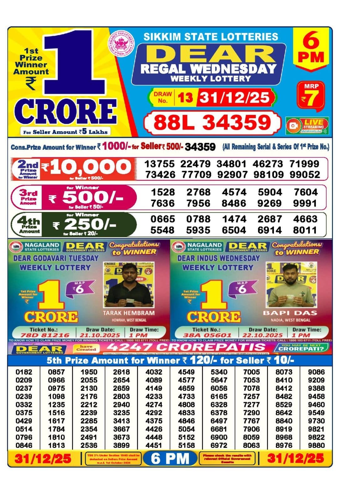 31 Tarikh Lottery Sambad 6 PM Evening Result | 31 তারিখ লটারি সংবাদ 6 PM রেজাল্ট