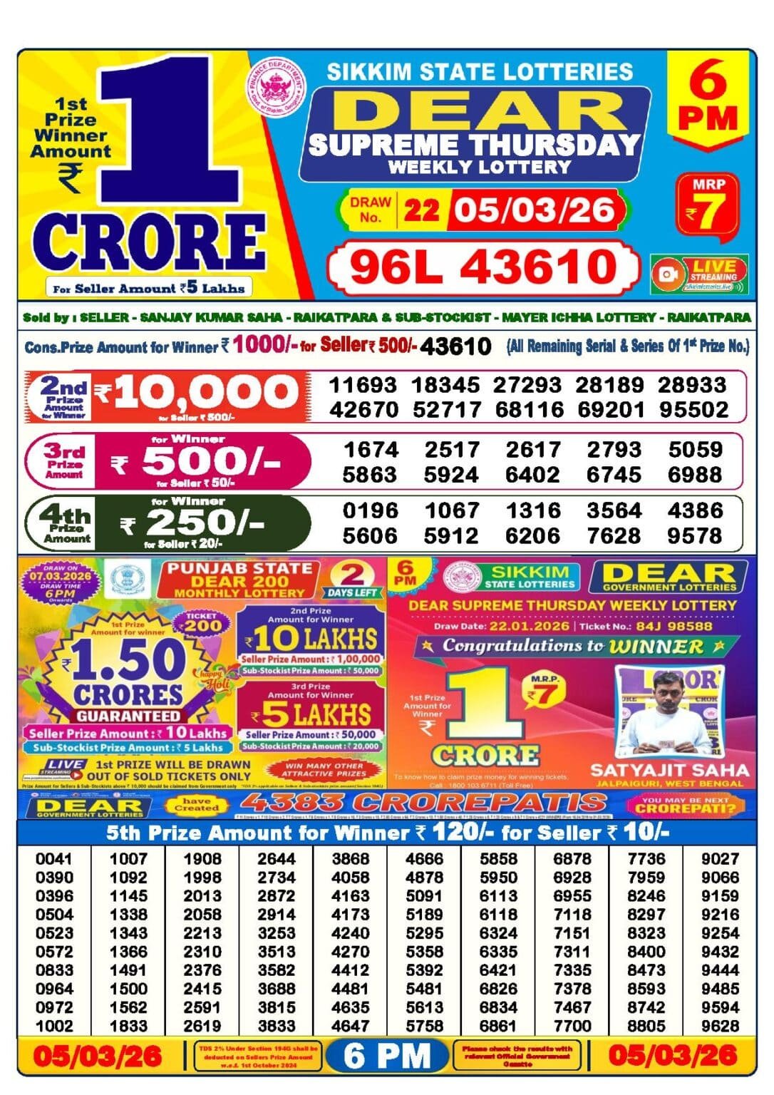 5 Tarikh Lottery Sambad Result এর Details গুলি নিচে দেওয়া হল