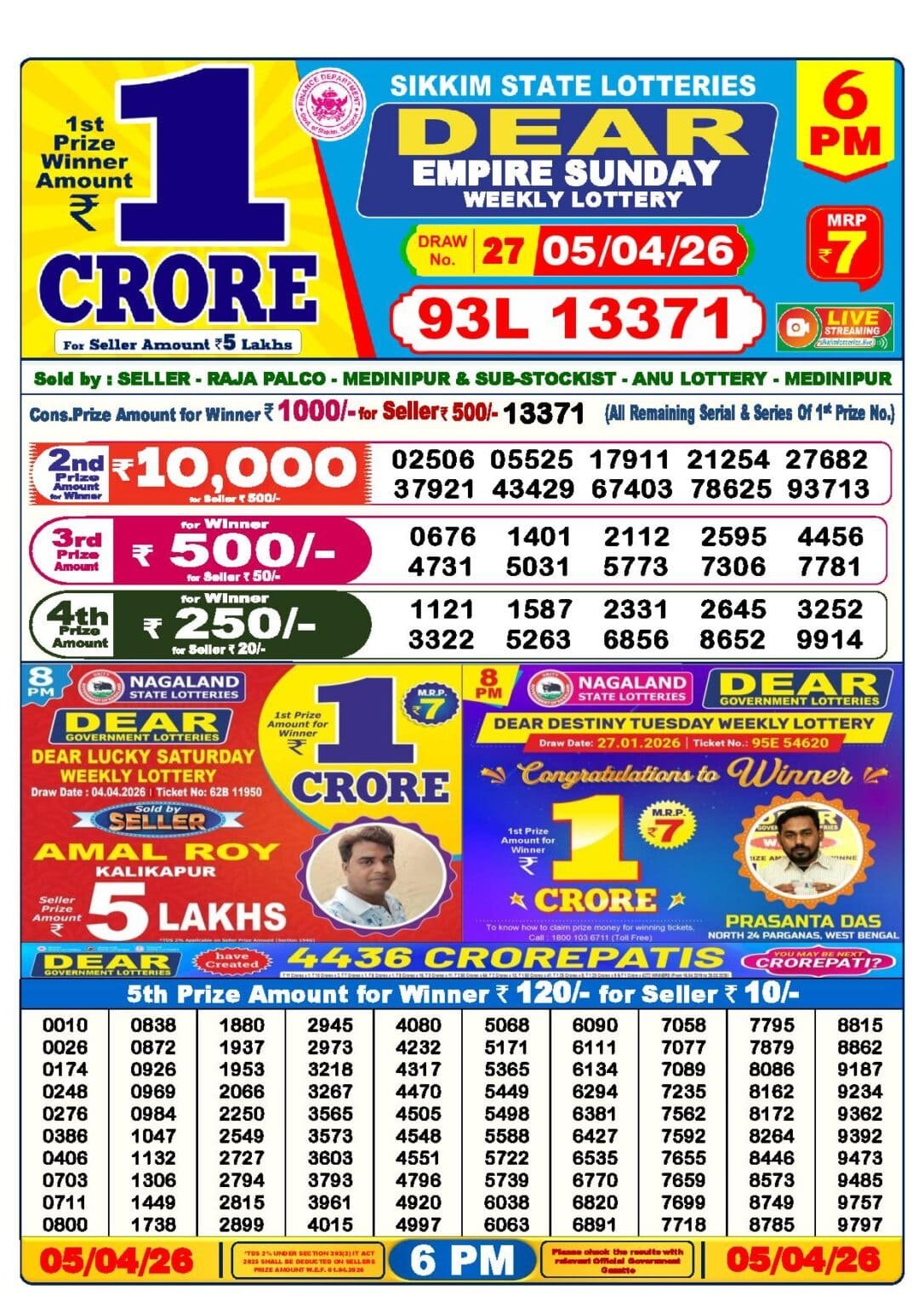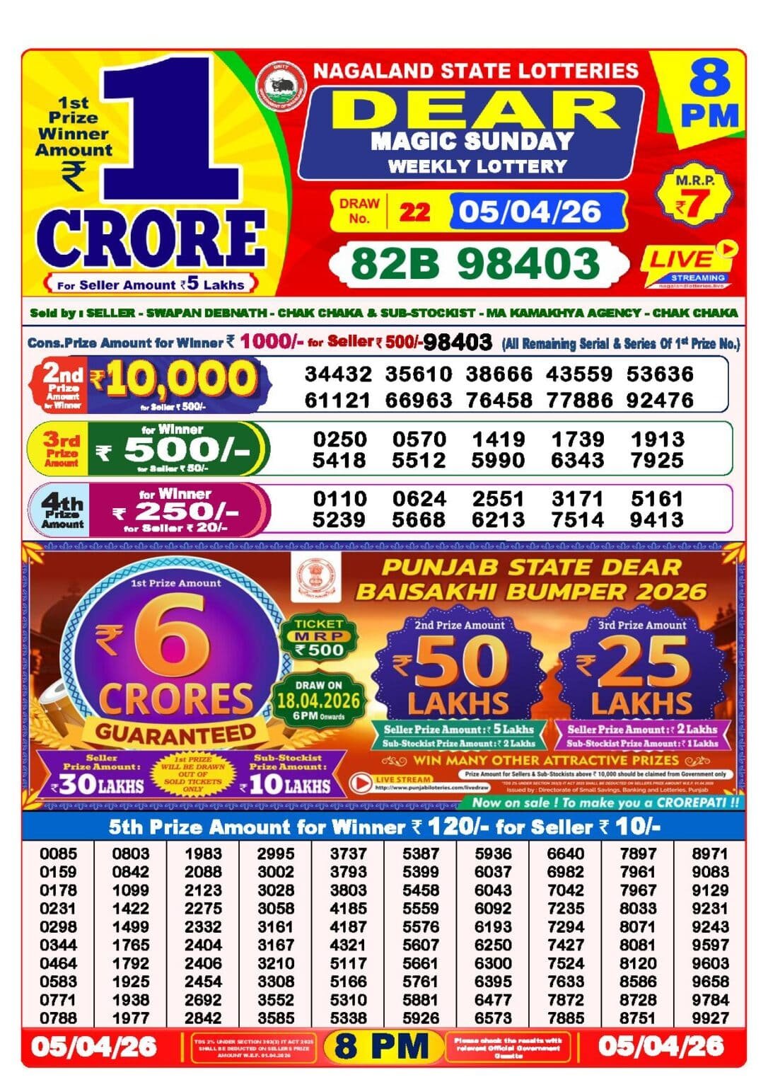 আপনি কি 5 Tarikh Lottery Sambad 1 PM, 6 PM, 8 PM Result এর ফলাফল দেখতে চান, তাহলে আপনি সঠিক জায়গাতে এসেছেন. আমরা প্রতিদিন এই ওয়েবসাইটে Nagaland State Lottery Sambad, Lottery Sambad Morning Draw List, Lottery Sambad Evening Draw List, Lottery Sambad Night Draw List এর ফলাফল সঠিক সময়ে প্রকাশ করি. এই 5 Tarikh Lottery Sambad এর প্রথম পুরস্কার রয়েছে 1 কোটি টাকা, দ্বিতীয় পুরস্কার 9000 টাকা, তৃতীয় পুরস্কার 450 টাকা, চতুর্থ পুরস্কার 250 টাকা, এবং 5ম পুরস্কার রয়েছে 100 টাকা. Nagaland State Dear Lottery Sambad Department আজকের Result ফলাফল ঘোষণা করেছে, আজকের সমস্ত Result ফলাফলের লিস্ট গুলি নীচে দেওয়া হল।